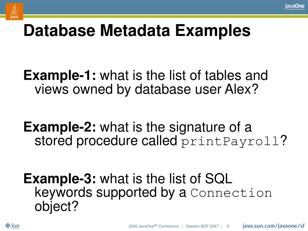 Database Metadata Examples Example-1: what is the list of tables and views owned by database user Alex? Example-2: what is the signature of a stored procedure called printPayroll? Example-3: what is the list of SQL keywords supported by a Connection object?