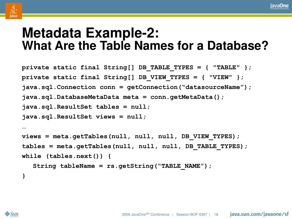 Metadata Example-2:What Are the Table Names for a Database? private static final String[] DB_TABLE_TYPES = { "TABLE" }; private static final String[] DB_VIEW_TYPES = { "VIEW" }; java.sql.Connection conn = getConnection(“datasourceName”); java.sql.DatabaseMetaData meta = conn.getMetaData(); java.sql.ResultSet tables = null; java.sql.ResultSet views = null; … views = meta.getTables(null, null, null, DB_VIEW_TYPES); tables = meta.getTables(null, null, null, DB_TABLE_TYPES); while (tables.next()) { String tableName = rs.getString(“TABLE_NAME”); }