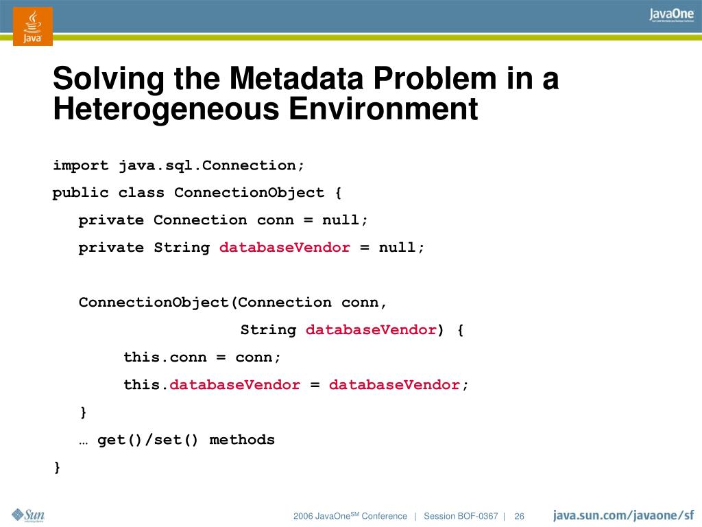 Solving the Metadata Problem in a HeterogeneousEnvironment import java.sql.Connection; public class ConnectionObject { private Connection conn = null; private String databaseVendor = null; ConnectionObject(Connection conn, String databaseVendor) { this.conn = conn; this.databaseVendor = databaseVendor; } … get()/set() methods }