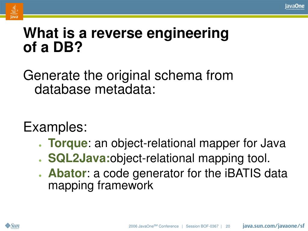 What is a reverse engineering of a DB? Generate the original schema from database metadata: Examples: • Torque: an object-relational mapper for Java • SQL2Java:object-relational mapping tool. • Abator: a code generator for the iBATIS data mapping framework