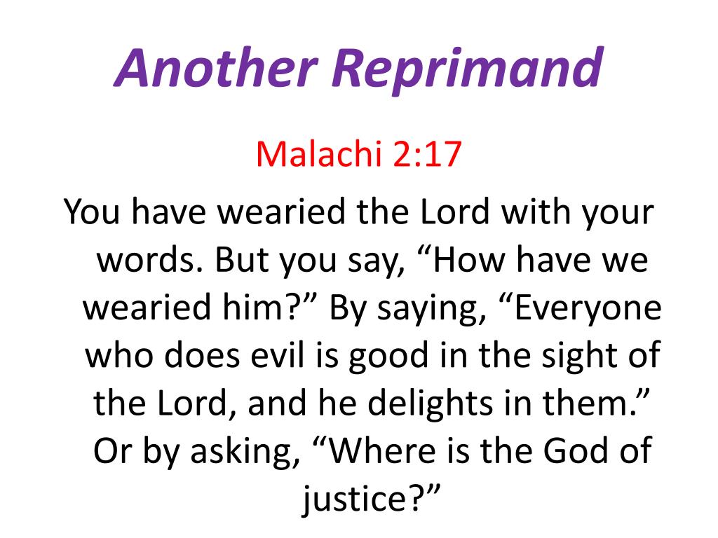 Another Reprimand Malachi 2:17 You have wearied the Lord with your words. But you say, “How have we wearied him?” By saying, “Everyone who does evil is good in the sight of the Lord, and he delights in them.” Or by asking, “Where is the God of justice?”