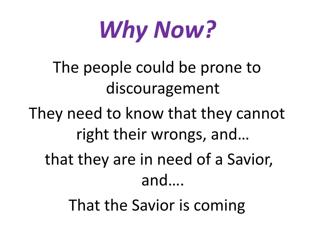 Why Now? The people could be prone to discouragement They need to know that they cannot right their wrongs, and… that they are in need of a Savior, and…. That the Savior is coming