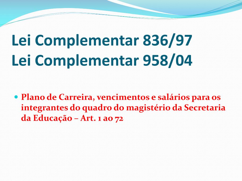 Lei Complementar 836/97Lei Complementar 958/04 • Plano de Carreira, vencimentos e salários para os integrantes do quadro do magistério da Secretaria da Educação – Art. 1 ao 72