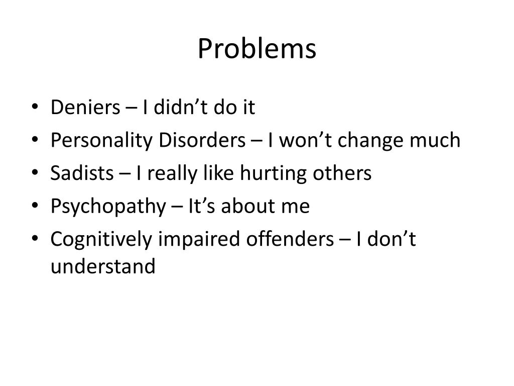Problems • Deniers – I didn’t do it • Personality Disorders – I won’t change much • Sadists – I really like hurting others • Psychopathy – It’s about me • Cognitively impaired offenders – I don’t understand