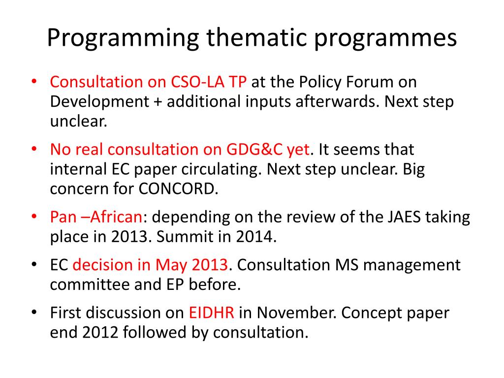 Programming thematic programmes • Consultation on CSO-LA TP at the Policy Forum on Development+ additional inputs afterwards. Next step unclear. • No real consultation on GDG&C yet. It seems that internal EC paper circulating. Next step unclear. Big concern for CONCORD. • Pan –African: depending on the review of the JAES taking place in 2013. Summit in 2014. • EC decision in May 2013. Consultation MS management committee and EP before. • First discussion on EIDHR in November. Concept paper end 2012 followed by consultation.