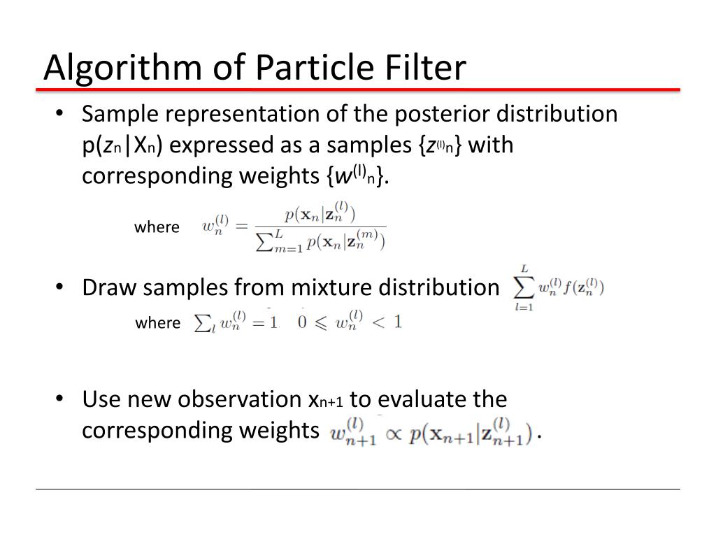 Algorithm of Particle Filter Sample representation of the posterior distribution p(zn|Xn) expressed as a samples {z(l)n} with corresponding weights {w(l)n}. Draw samples from mixture distribution Use new observation xn+1 to evaluate the corresponding weights . where where