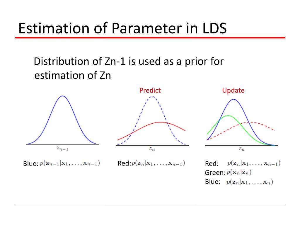 Estimation of Parameter in LDS Distribution of Zn-1 is used as a prior for estimation of Zn Predict Update Red: Blue: Red: Green: Blue: