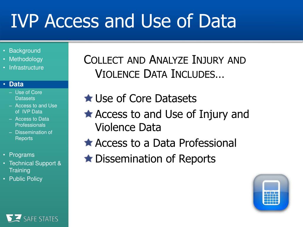 IVP Access and Use of Data Collect and Analyze Injury and Violence Data Includes… • Use of Core Datasets • Access to and Use of Injury and Violence Data • Access to a Data Professional • Dissemination of Reports • Background • Methodology • Infrastructure • Data • Use of Core Datasets • Access to and Use of IVP Data • Access to Data Professionals • Dissemination of Reports • Programs • Technical Support & Training • Public Policy