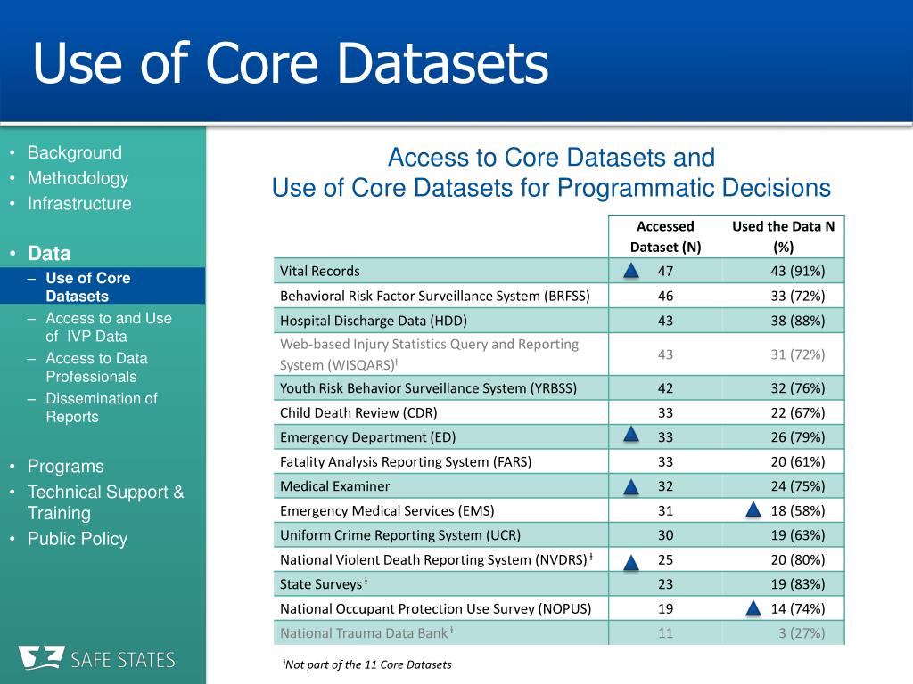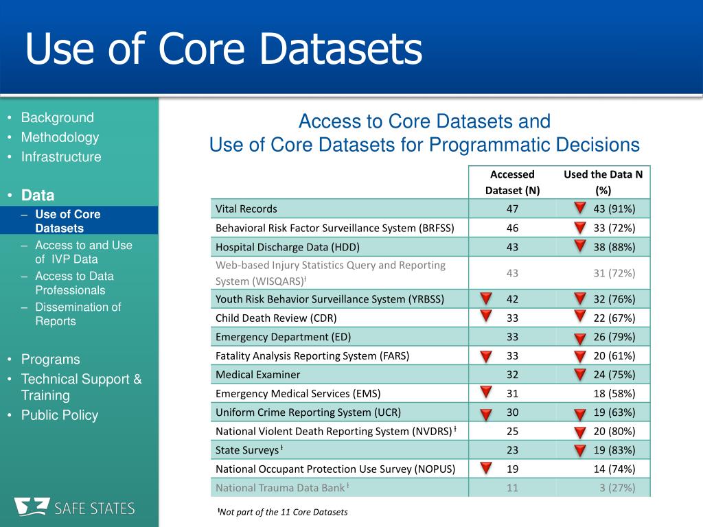 Use of Core Datasets Access to Core Datasets and Use of Core Datasets for Programmatic Decisions • Background • Methodology • Infrastructure • Data • Use of Core Datasets • Access to and Use of IVP Data • Access to Data Professionals • Dissemination of Reports • Programs • Technical Support & Training • Public Policy ⱡNot part of the 11 Core Datasets