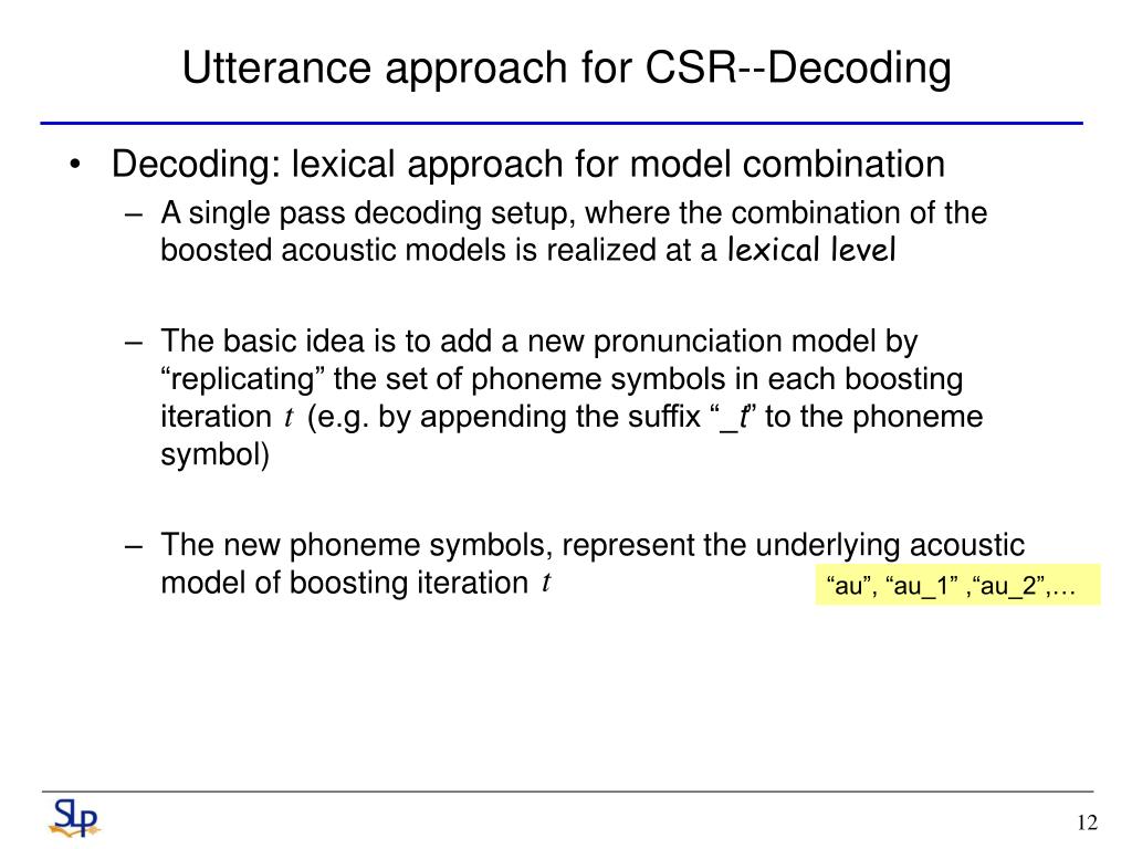 Utterance approach for CSR--Decoding • Decoding: lexical approach for model combination • A single pass decoding setup, where the combination of the boosted acoustic models is realized at a lexical level • The basic idea is to add a new pronunciation model by “replicating” the set of phoneme symbols in each boosting iteration (e.g. by appending the suffix “_t” to the phoneme symbol) • The new phoneme symbols, represent the underlying acoustic model of boosting iteration “au”, “au_1” ,“au_2”,…