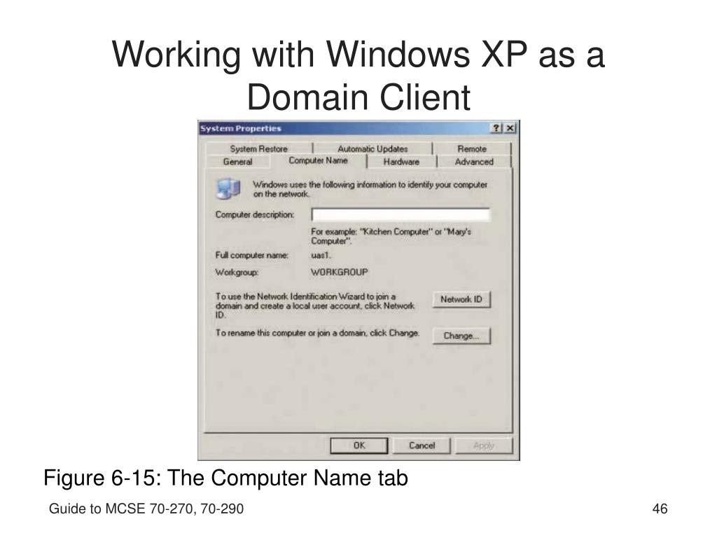 Working with Windows XP as a Domain Client (continued) • Activity 6-7: Joining a Domain: Method 1 • Objective: Add an XP Professional client to Active Directory by creating the computer account on the client • Activity 6-8: Joining a Domain: Method 2 • Objective: Add a Windows XP Professional system to a domain by creating a computer account on a domain controller • Managing a Domain Client: • Domain enforces control over clients using GPOs Guide to MCSE 70-270, 70-290