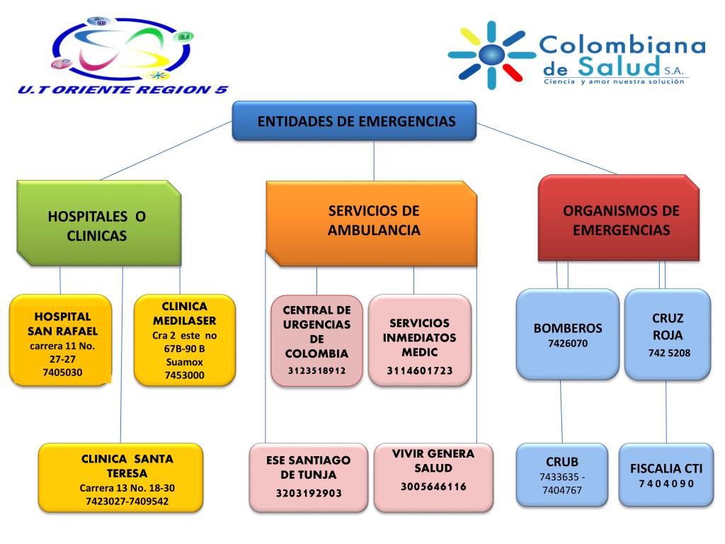 ENTIDADES DE EMERGENCIAS SERVICIOS DE AMBULANCIA ORGANISMOS DE EMERGENCIAS HOSPITALES O CLINICAS BOMBEROS 7426070 CRUZ ROJA 742 5208 CLINICA MEDILASER Cra 2 este no 67B-90 B Suamox 7453000 SERVICIOS INMEDIATOS MEDIC 3114601723 CENTRAL DE URGENCIAS DE COLOMBIA 3123518912 HOSPITAL SAN RAFAEL carrera 11 No. 27-27 7405030 ESE SANTIAGO DE TUNJA 3203192903 VIVIR GENERA SALUD 3005646116 CRUB 7433635 - 7404767 FISCALIA CTI 7 4 0 4 0 9 0 CLINICA SANTA TERESA Carrera 13 No. 18-30 7423027-7409542