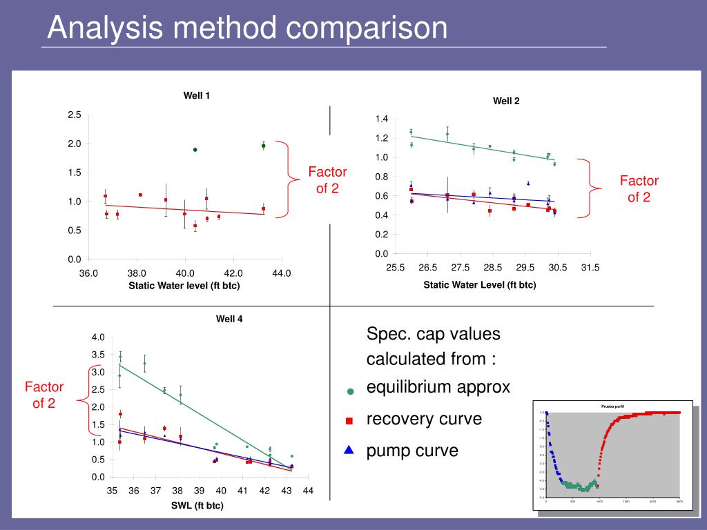 Conventional pump test comparison Spec. cap values calculated from manual tests: equilibrium approx recovery curve pump curve Spec. cap values calculated from conventional test: equilibrium approx recovery curve pump curve
