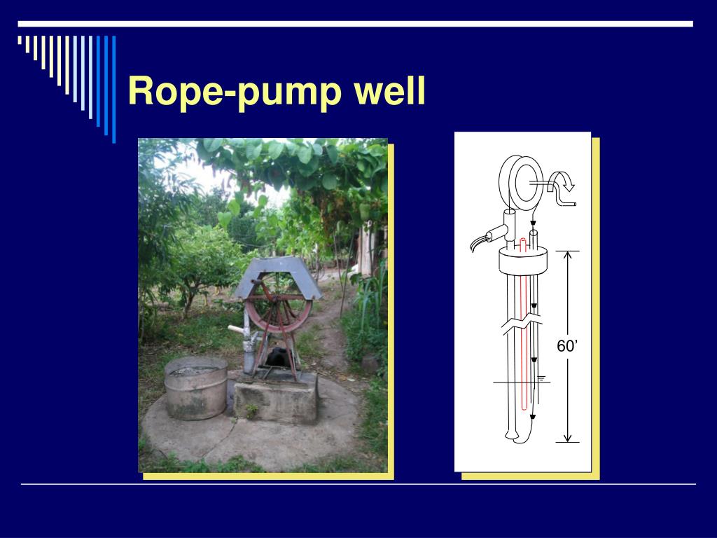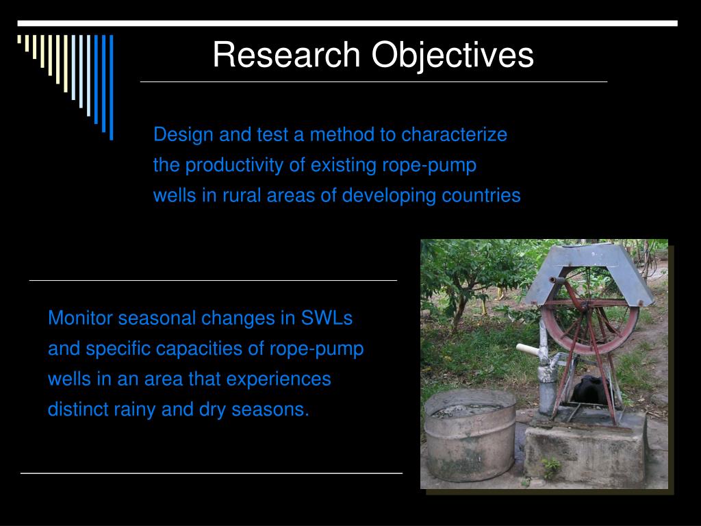 Research Objectives Design and test a method to characterize the productivity of existing rope-pump wells in rural areas of developing countries Monitor seasonal changes in SWLs and specific capacities of rope-pump wells in an area that experiences distinct rainy and dry seasons.