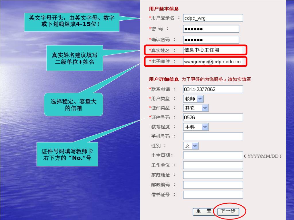 英文字母开头,由英文字母、数字或下划线组成4-15位!英文字母开头,由英文字母、数字或下划线组成4-15位! 真实姓名建议填写二级单位+姓名 选择稳定、容量大的信箱 证件号码填写教师卡右下方的“No.”号