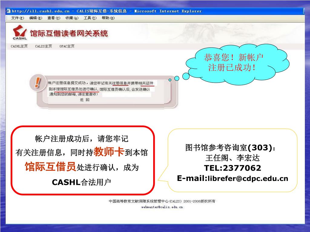 帐户注册成功后,请您牢记有关注册信息,同时持教师卡到本馆馆际互借员处进行确认,成为CASHL合法用户帐户注册成功后,请您牢记有关注册信息,同时持教师卡到本馆馆际互借员处进行确认,成为CASHL合法用户 恭喜您!新帐户注册已成功! 图书馆参考咨询室(303): 王任阁、李宏达 TEL:2377062 E-mail:librefer@cdpc.edu.cn