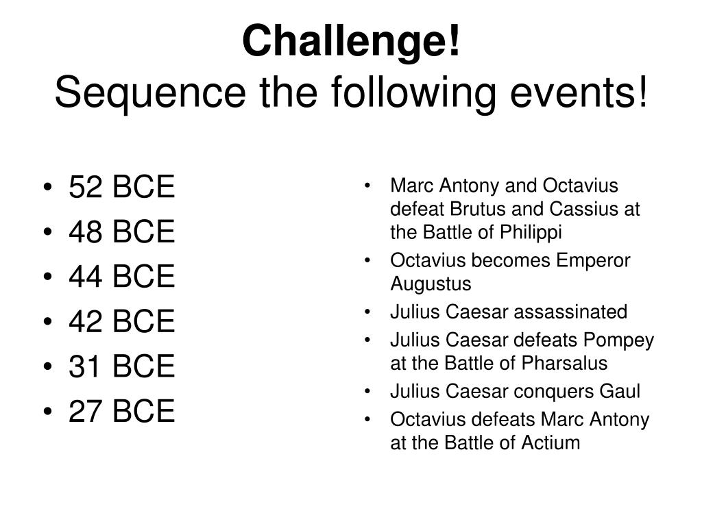 Challenge!Sequence the following events! • 52 BCE • 48 BCE • 44 BCE • 42 BCE • 31 BCE • 27 BCE • Marc Antony and Octavius defeat Brutus and Cassius at the Battle of Philippi • Octavius becomes Emperor Augustus • Julius Caesar assassinated • Julius Caesar defeats Pompey at the Battle of Pharsalus • Julius Caesar conquers Gaul • Octavius defeats Marc Antony at the Battle of Actium