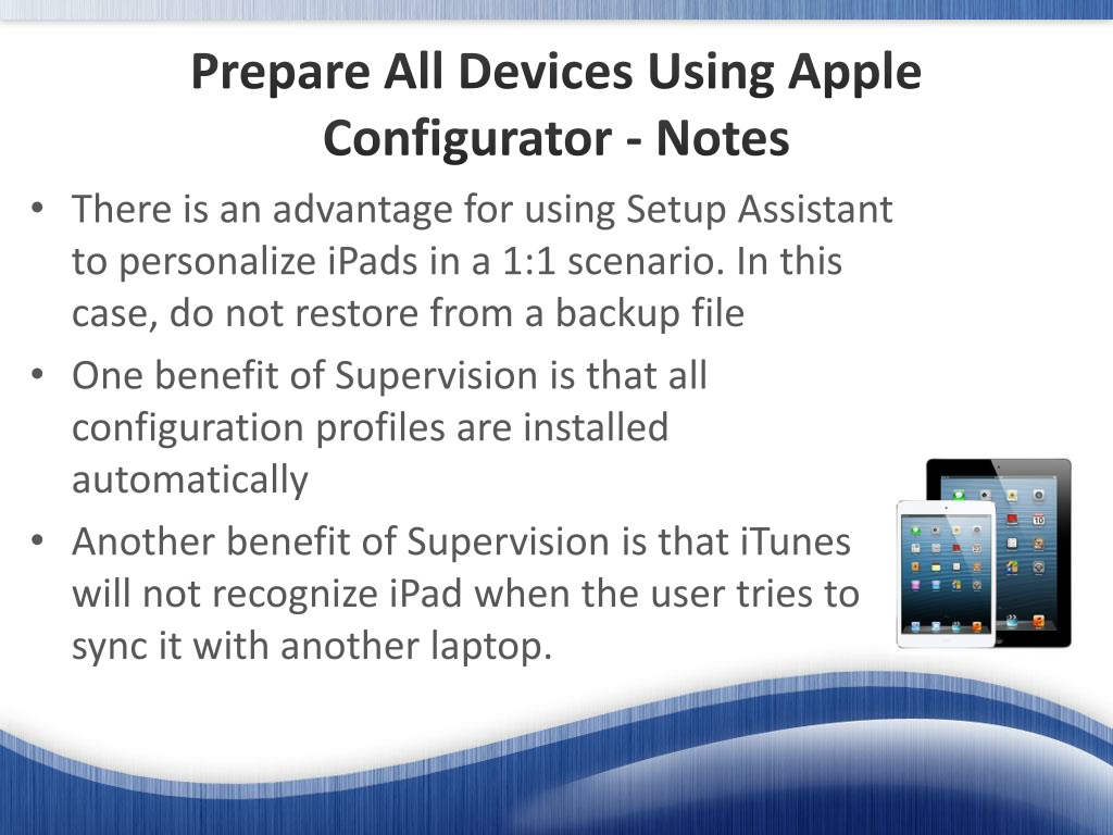 Prepare All Devices Using Apple Configurator - Notes • There is an advantage for using Setup Assistant to personalize iPads in a 1:1 scenario. In this case, do not restore from a backup file • One benefit of Supervision is that all configuration profiles are installed automatically • Another benefit of Supervision is that iTunes will not recognize iPad when the user tries to sync it with another laptop.