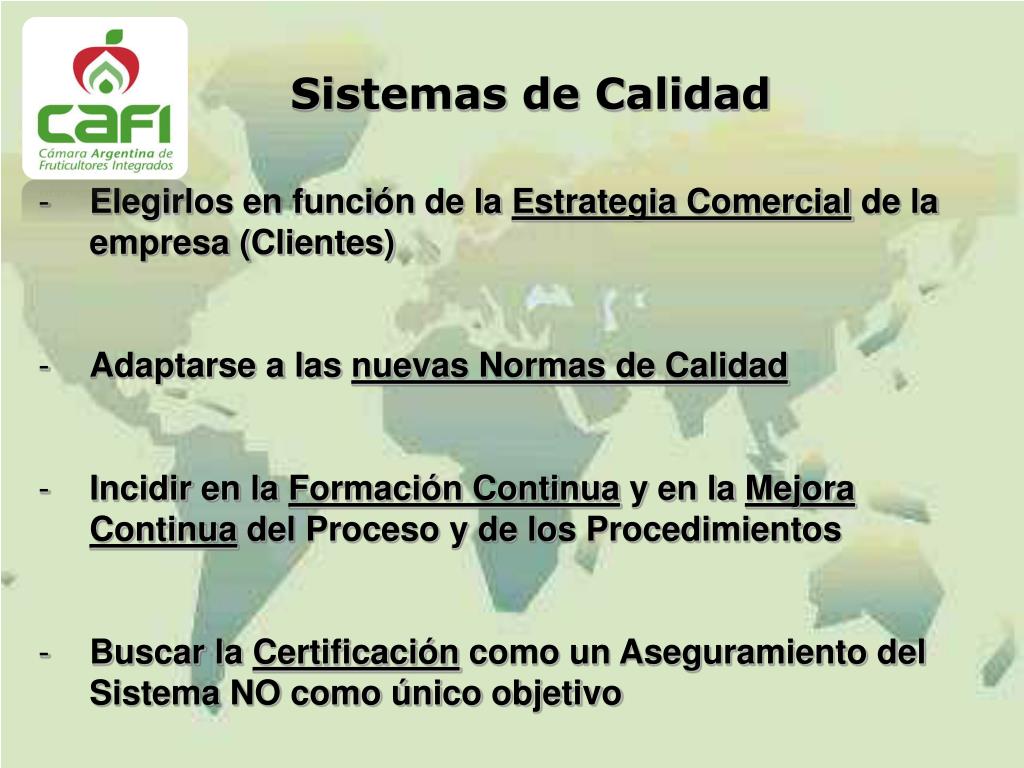 Sistemas de Calidad • Elegirlos en función de la Estrategia Comercial de la empresa (Clientes) • Adaptarse a las nuevas Normas de Calidad • Incidir en la Formación Continua y en la Mejora Continua del Proceso y de los Procedimientos • Buscar la Certificación como un Aseguramiento del Sistema NO como único objetivo