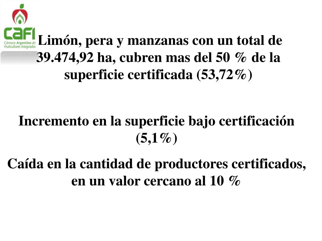 Limón, pera y manzanas con un total de 39.474,92 ha, cubren mas del 50 % de la superficie certificada (53,72%) Incremento en la superficie bajo certificación (5,1%) Caída en la cantidad de productores certificados, en un valor cercano al 10 %