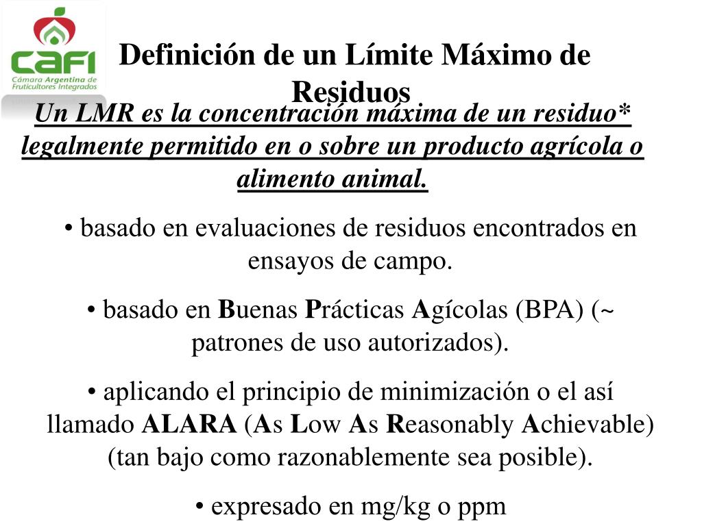 Definición de un Límite Máximo de Residuos • Un LMR es la concentración máxima de un residuo* legalmente permitido en o sobre un producto agrícola o alimento animal. • • basado en evaluaciones de residuos encontrados en ensayos de campo. • • basado en Buenas Prácticas Agícolas (BPA) (~ patrones de uso autorizados). • • aplicando el principio de minimización o el así llamado ALARA (As Low As Reasonably Achievable) (tan bajo como razonablemente sea posible). • • expresado en mg/kg o ppm