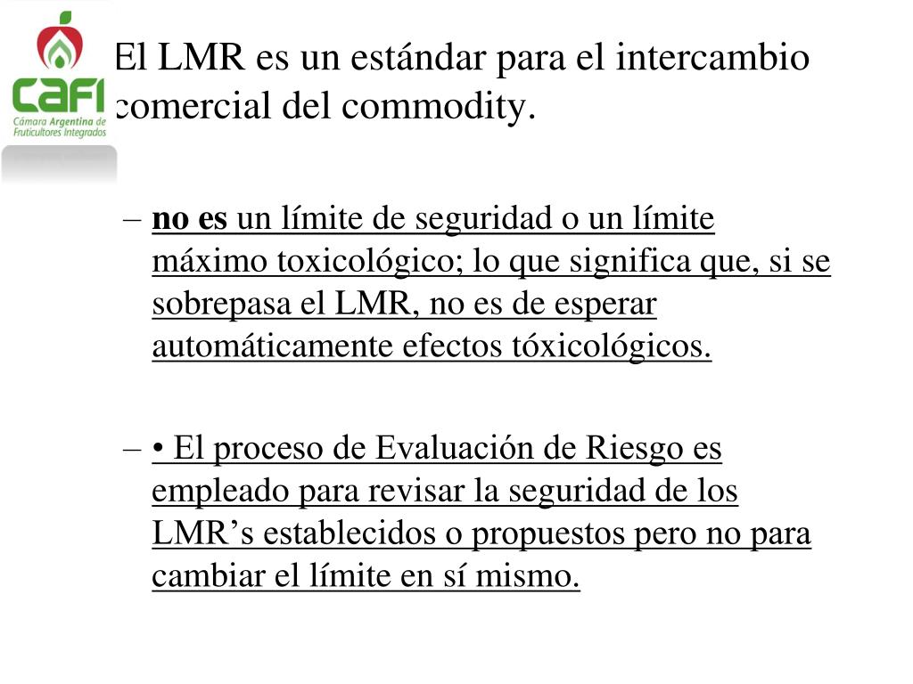El LMR es un estándar para el intercambio comercial del commodity. • no es un límite de seguridad o un límite máximo toxicológico; lo que significa que, si se sobrepasa el LMR, no es de esperar automáticamente efectos tóxicológicos. • • El proceso de Evaluación de Riesgo es empleado para revisar la seguridad de los LMR’s establecidos o propuestos pero no para cambiar el límite en sí mismo.
