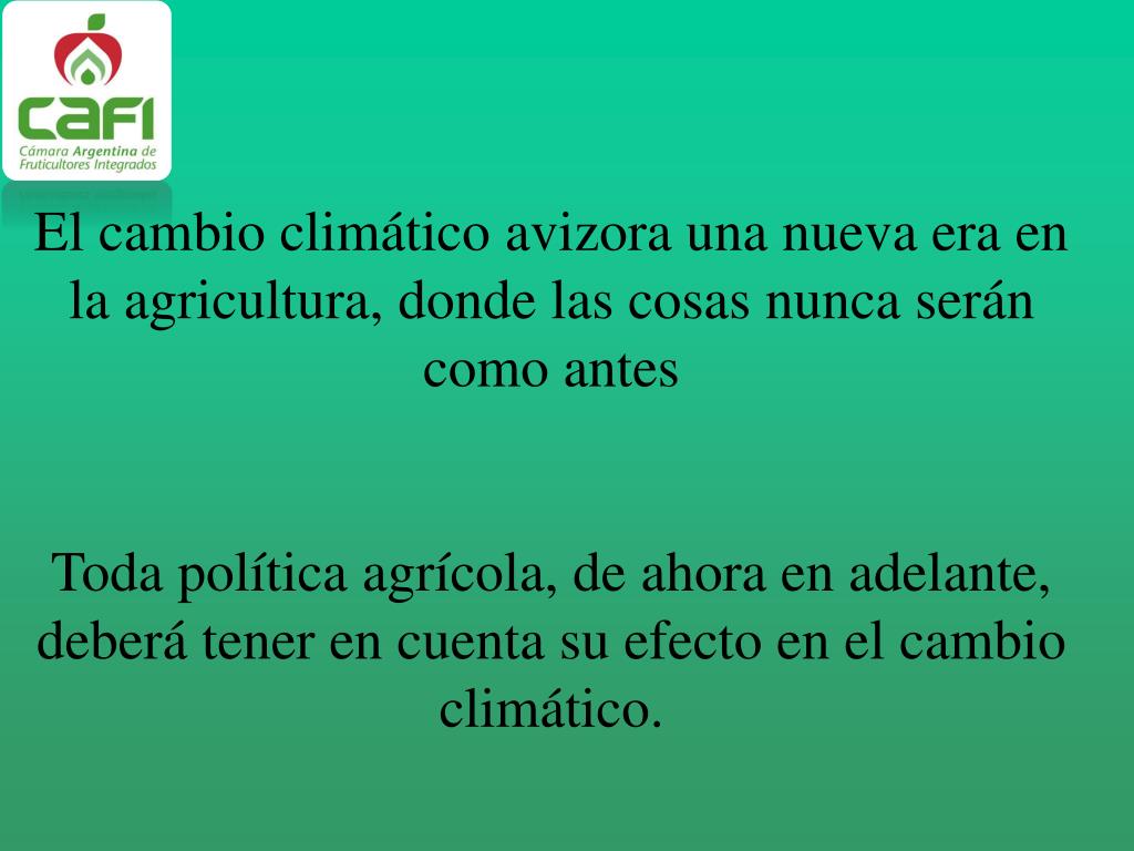 El cambio climático avizora una nueva era en la agricultura, donde las cosas nunca serán como antes Toda política agrícola, de ahora en adelante, deberá tener en cuenta su efecto en el cambio climático.