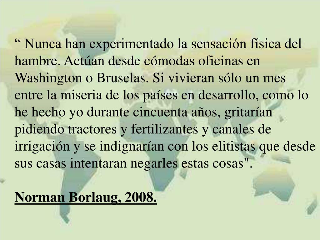 “ Nunca han experimentado la sensación física del hambre. Actúan desde cómodas oficinas en Washington o Bruselas. Si vivieran sólo un mes entre la miseria de los países en desarrollo, como lo he hecho yo durante cincuenta años, gritarían pidiendo tractores y fertilizantes y canales de irrigación y se indignarían con los elitistas que desde sus casas intentaran negarles estas cosas". Norman Borlaug, 2008.