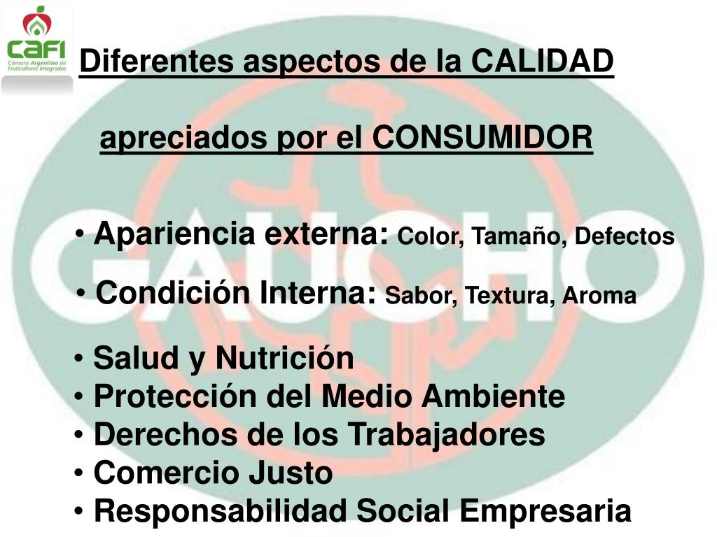 Diferentes aspectos de la CALIDAD apreciados por el CONSUMIDOR • Apariencia externa: Color, Tamaño, Defectos • Salud y Nutrición • Protección del Medio Ambiente • Derechos de los Trabajadores • Comercio Justo • Responsabilidad Social Empresaria • Condición Interna: Sabor, Textura, Aroma
