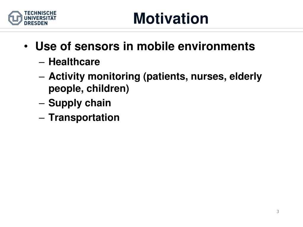 Motivation • Use of sensors in mobile environments • Healthcare • Activity monitoring (patients, nurses, elderly people, children) • Supply chain • Transportation