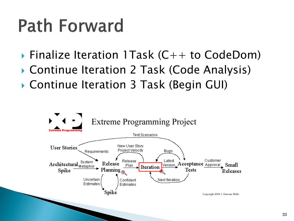 Path Forward Finalize Iteration 1Task (C++ to CodeDom) Continue Iteration 2 Task (Code Analysis) Continue Iteration 3 Task (Begin GUI)