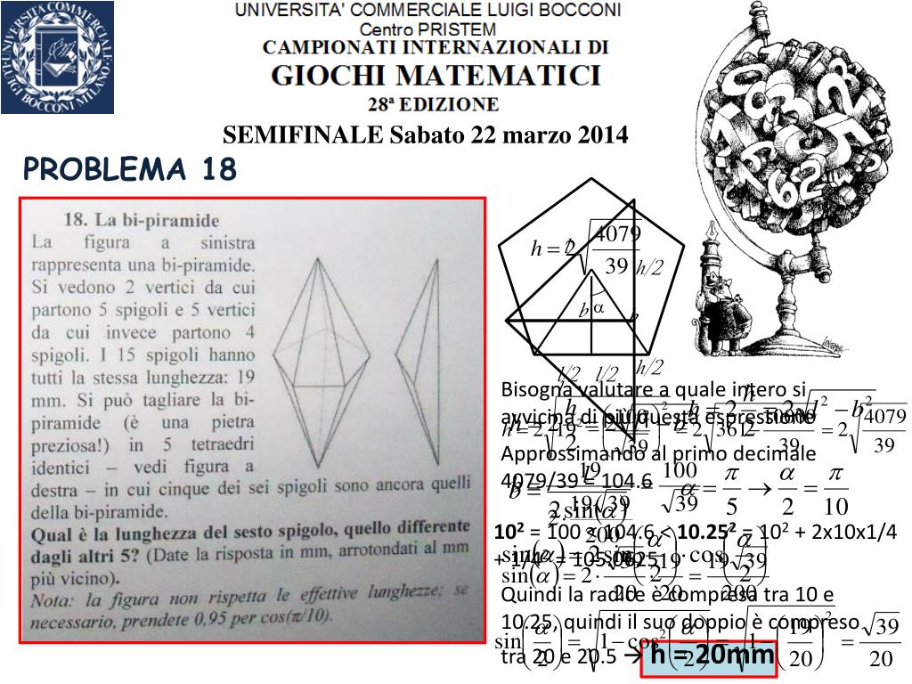 SEMIFINALE Sabato 22 marzo 2014 PROBLEMA 18 l h/2 a b b h/2 l/2 l/2 Bisogna valutare a quale intero si avvicina di più questa espressione l Approssimando al primo decimale 4079/39 = 104.6 102 = 100 < 104.6 < 10.252 = 102 + 2x10x1/4 + 1/42 = 105.0625 Quindi la radice è compresa tra 10 e 10.25, quindi il suo doppio è compreso tra 20 e 20.5 h = 20mm