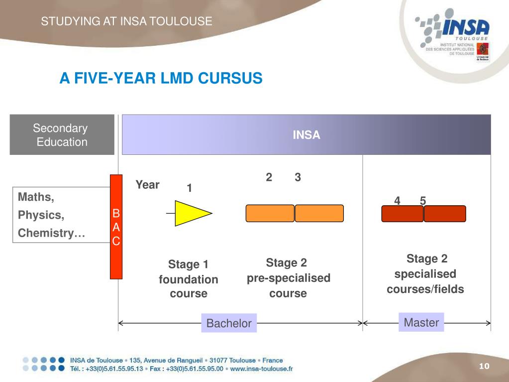 STUDYING AT INSA TOULOUSE A FIVE-YEAR LMD CURSUS Secondary Education INSA 2 3 B A C Year 1 Maths, Physics, Chemistry… 4 5 Stage 2 specialised courses/fields Stage 2 pre-specialised course Stage 1 foundationcourse Master Bachelor