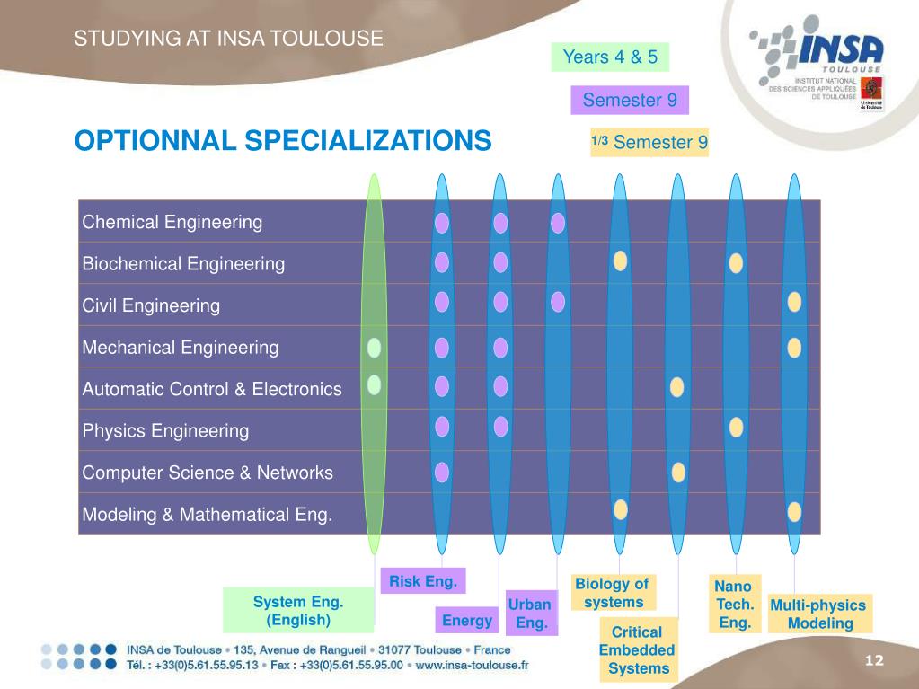 STUDYING AT INSA TOULOUSE Years 4 & 5 Semester 9 OPTIONNAL SPECIALIZATIONS 1/3 Semester 9 Chemical Engineering Biochemical Engineering Civil Engineering Mechanical Engineering Automatic Control & Electronics Physics Engineering Computer Science & Networks Modeling & Mathematical Eng. Risk Eng. Biology of systems Nano Tech. Eng. System Eng. (English) Urban Eng. Multi-physics Modeling Energy Critical Embedded Systems