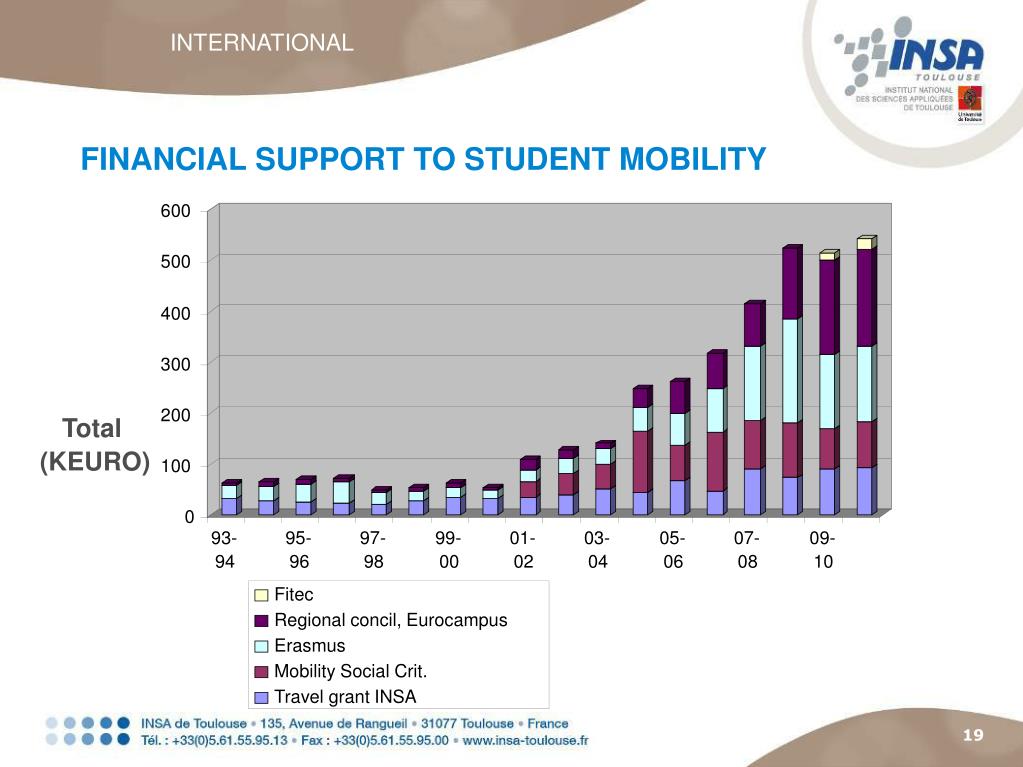 600 500 400 Fitec 300 Regional concil, Eurocampus Erasmus 200 Mobility Social Crit. 100 Travel grant INSA 0 93- 95- 97- 99- 01- 03- 05- 07- 09- 94 96 98 00 02 04 06 08 10 Year INTERNATIONAL FINANCIAL SUPPORT TO STUDENT MOBILITY Total (KEURO)