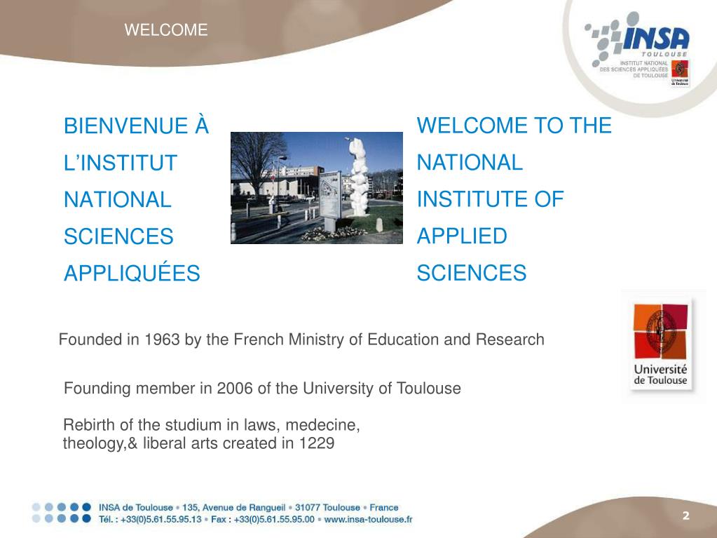 BIENVENUE À L’INSTITUT NATIONAL SCIENCES APPLIQUÉES Founding member in 2006 of the University of Toulouse WELCOME WELCOME TO THE NATIONAL INSTITUTE OF APPLIED SCIENCES Founded in 1963 by the French Ministry of Education and Research Rebirth of the studium in laws, medecine, theology,& liberal arts created in 1229