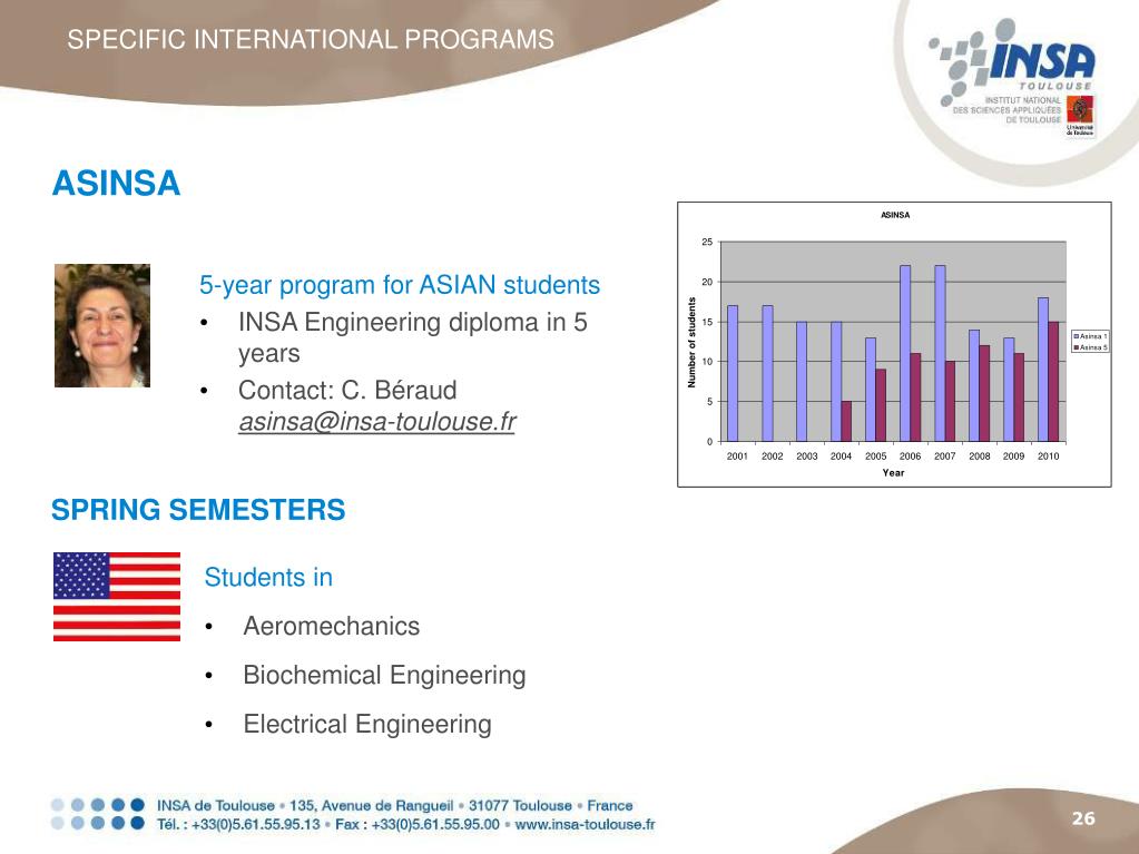 SPECIFIC INTERNATIONAL PROGRAMS ASINSA • 5-year program for ASIAN students • INSA Engineering diploma in 5 years • Contact: C. Béraud asinsa@insa-toulouse.fr SPRING SEMESTERS • Students in • Aeromechanics • Biochemical Engineering • Electrical Engineering