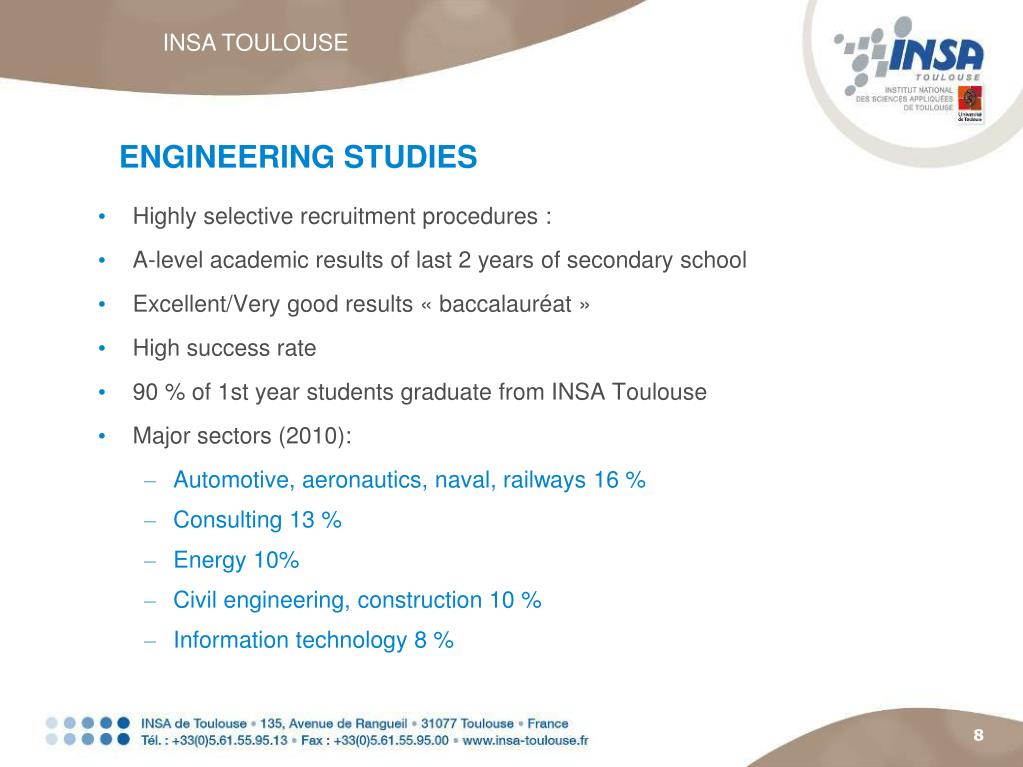 INSA TOULOUSE ENGINEERING STUDIES • Highly selective recruitment procedures : • A-level academic results of last 2 years of secondary school • Excellent/Very good results « baccalauréat » • High success rate • 90 % of 1st year students graduate from INSA Toulouse • Major sectors (2010): • Automotive, aeronautics, naval, railways 16 % • Consulting 13 % • Energy 10% • Civil engineering, construction 10 % • Information technology 8 %