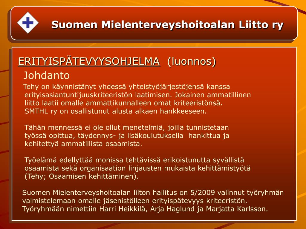 Suomen Mielenterveyshoitoalan Liitto ry ERITYISPÄTEVYYSOHJELMA (luonnos) Johdanto Tehy on käynnistänyt yhdessä yhteistyöjärjestöjensä kanssa erityisasiantuntijuuskriteeristön laatimisen. Jokainen ammatillinen liitto laatii omalle ammattikunnalleen omat kriteeristönsä. SMTHL ry on osallistunut alusta alkaen hankkeeseen. Tähän mennessä ei ole ollut menetelmiä, joilla tunnistetaan työssä opittua, täydennys- ja lisäkoulutuksella hankittua ja kehitettyä ammatillista osaamista. Työelämä edellyttää monissa tehtävissä erikoistunutta syvällistä osaamista sekä organisaation linjausten mukaista kehittämistyötä (Tehy; Osaamisen kehittäminen). Suomen Mielenterveyshoitoalan liiton hallitus on 5/2009 valinnut työryhmän valmistelemaan omalle jäsenistölleen erityispätevyys kriteeristön. Työryhmään nimettiin Harri Heikkilä, Arja Haglund ja Marjatta Karlsson.