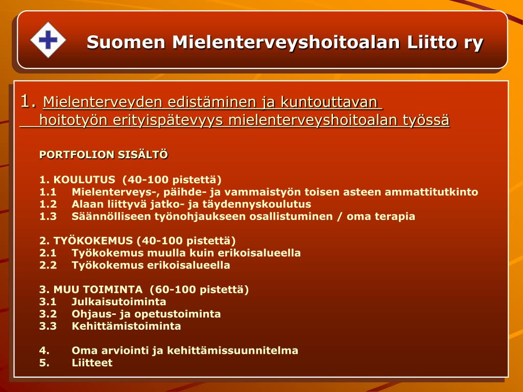 Suomen Mielenterveyshoitoalan Liitto ry 1.Mielenterveyden edistäminen ja kuntouttavan hoitotyön erityispätevyys mielenterveyshoitoalan työssä PORTFOLION SISÄLTÖ 1. KOULUTUS (40-100 pistettä) 1.1 Mielenterveys-, päihde- ja vammaistyön toisen asteen ammattitutkinto 1.2 Alaan liittyvä jatko- ja täydennyskoulutus 1.3 Säännölliseen työnohjaukseen osallistuminen / oma terapia 2. TYÖKOKEMUS (40-100 pistettä) 2.1 Työkokemus muulla kuin erikoisalueella 2.2 Työkokemus erikoisalueella 3. MUU TOIMINTA (60-100 pistettä) 3.1 Julkaisutoiminta 3.2 Ohjaus- ja opetustoiminta 3.3 Kehittämistoiminta 4. Oma arviointi ja kehittämissuunnitelma 5. Liitteet