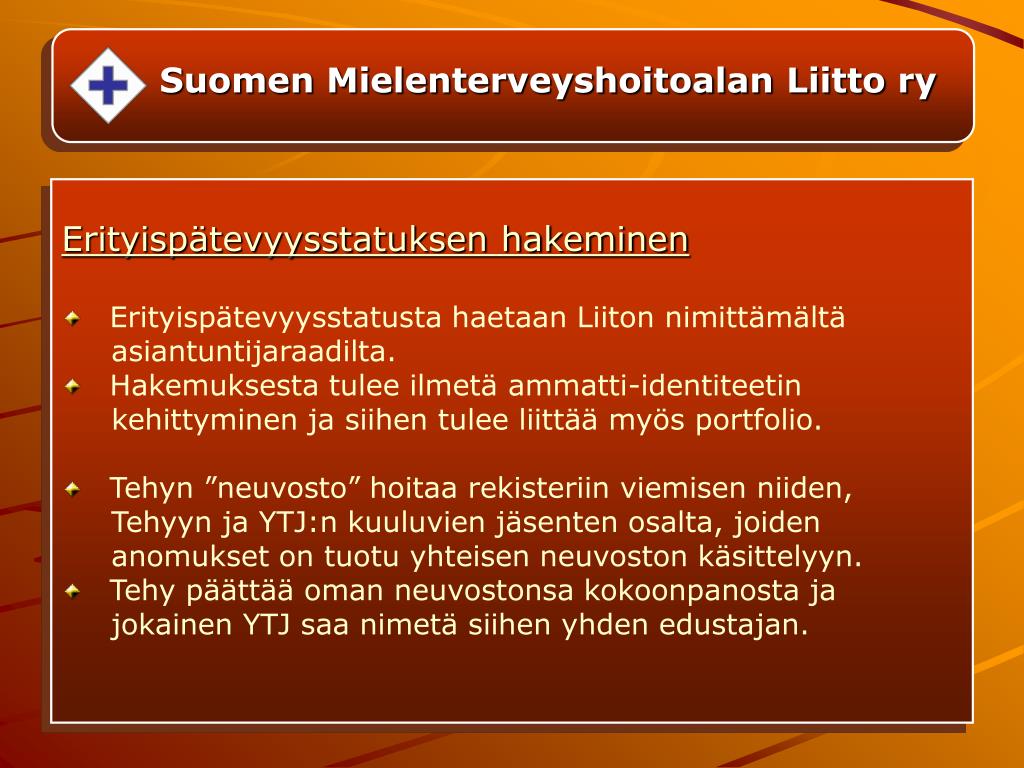 Suomen Mielenterveyshoitoalan Liitto ry Erityispätevyysstatuksen hakeminen • Erityispätevyysstatusta haetaan Liiton nimittämältä asiantuntijaraadilta. • Hakemuksesta tulee ilmetä ammatti-identiteetin kehittyminen ja siihen tulee liittää myös portfolio. • Tehyn ”neuvosto” hoitaa rekisteriin viemisen niiden, Tehyyn ja YTJ:n kuuluvien jäsenten osalta, joiden anomukset on tuotu yhteisen neuvoston käsittelyyn. • Tehy päättää oman neuvostonsa kokoonpanosta ja jokainen YTJ saa nimetä siihen yhden edustajan.