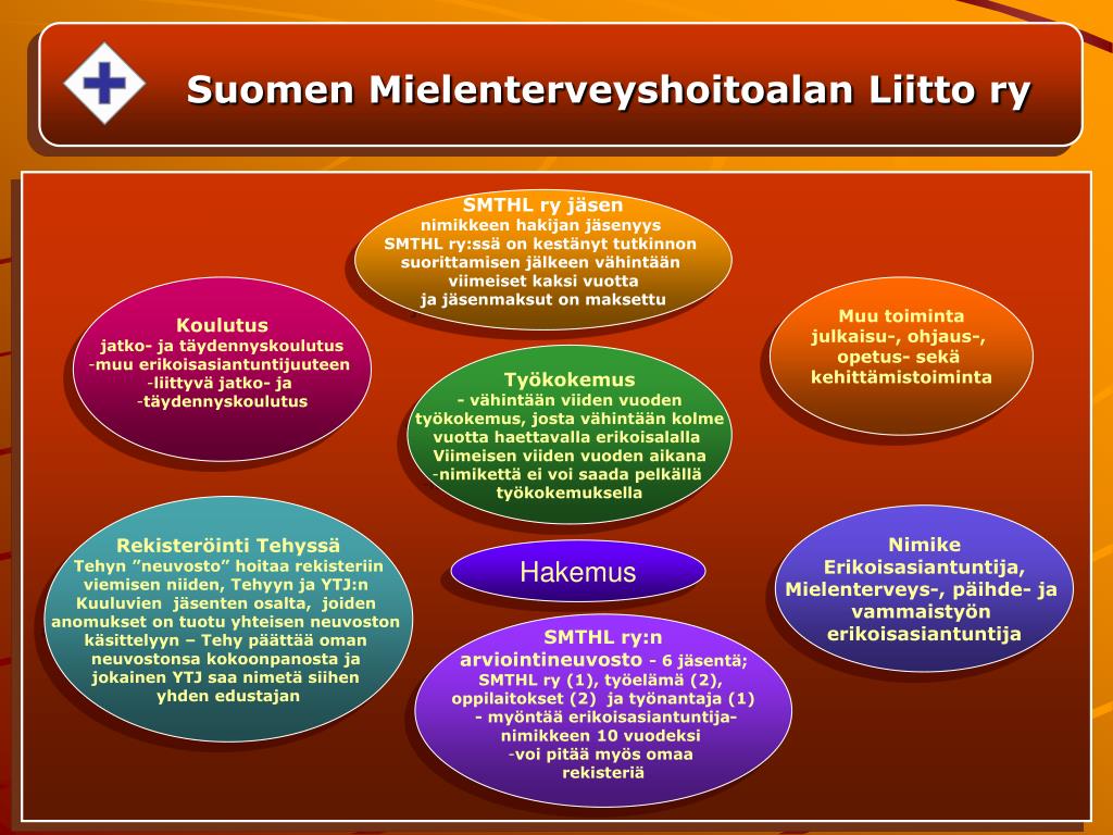 Suomen Mielenterveyshoitoalan Liitto ry SMTHL ry jäsen nimikkeen hakijan jäsenyys SMTHL ry:ssä on kestänyt tutkinnon suorittamisen jälkeen vähintään viimeiset kaksi vuotta ja jäsenmaksut on maksettu • Koulutus • jatko- ja täydennyskoulutus • muu erikoisasiantuntijuuteen • liittyvä jatko- ja • täydennyskoulutus Muu toiminta julkaisu-, ohjaus-, opetus- sekä kehittämistoiminta • Työkokemus • - vähintään viiden vuoden • työkokemus, josta vähintään kolme • vuotta haettavalla erikoisalalla • Viimeisen viiden vuoden aikana • nimikettä ei voi saada pelkällä • työkokemuksella Rekisteröinti Tehyssä Tehyn ”neuvosto” hoitaa rekisteriin viemisen niiden, Tehyyn ja YTJ:n Kuuluvien jäsenten osalta, joiden anomukset on tuotu yhteisen neuvoston käsittelyyn – Tehy päättää oman neuvostonsa kokoonpanosta ja jokainen YTJ saa nimetä siihen yhden edustajan Nimike Erikoisasiantuntija, Mielenterveys-, päihde- ja vammaistyön erikoisasiantuntija Hakemus • SMTHL ry:n • arviointineuvosto - 6 jäsentä; • SMTHL ry (1), työelämä (2), • oppilaitokset (2) ja työnantaja (1) • - myöntää erikoisasiantuntija- • nimikkeen 10 vuodeksi • voi pitää myös omaa • rekisteriä