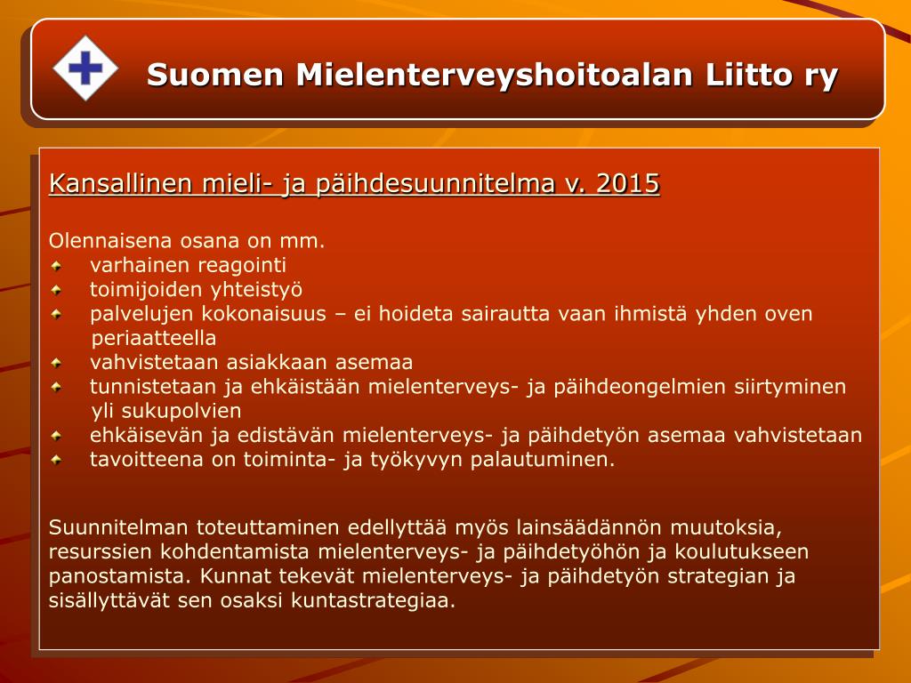 Suomen Mielenterveyshoitoalan Liitto ry Kansallinen mieli- ja päihdesuunnitelma v. 2015 Olennaisena osana on mm. • varhainen reagointi • toimijoiden yhteistyö • palvelujen kokonaisuus – ei hoideta sairautta vaan ihmistä yhden oven periaatteella • vahvistetaan asiakkaan asemaa • tunnistetaan ja ehkäistään mielenterveys- ja päihdeongelmien siirtyminen yli sukupolvien • ehkäisevän ja edistävän mielenterveys- ja päihdetyön asemaa vahvistetaan • tavoitteena on toiminta- ja työkyvyn palautuminen. Suunnitelman toteuttaminen edellyttää myös lainsäädännön muutoksia, resurssien kohdentamista mielenterveys- ja päihdetyöhön ja koulutukseen panostamista. Kunnat tekevät mielenterveys- ja päihdetyön strategian ja sisällyttävät sen osaksi kuntastrategiaa.