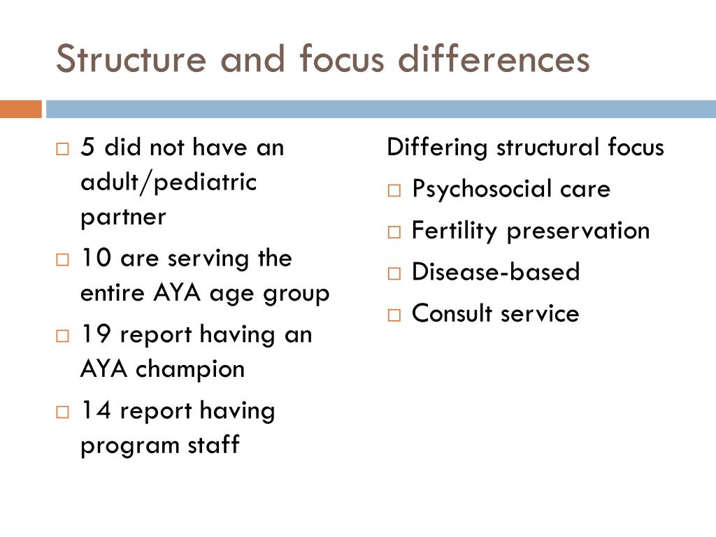 Structure and focus differences • 5 did not have an adult/pediatric partner • 10 are serving the entire AYA age group • 19 report having an AYA champion • 14 report having program staff Differing structural focus • Psychosocial care • Fertility preservation • Disease-based • Consult service