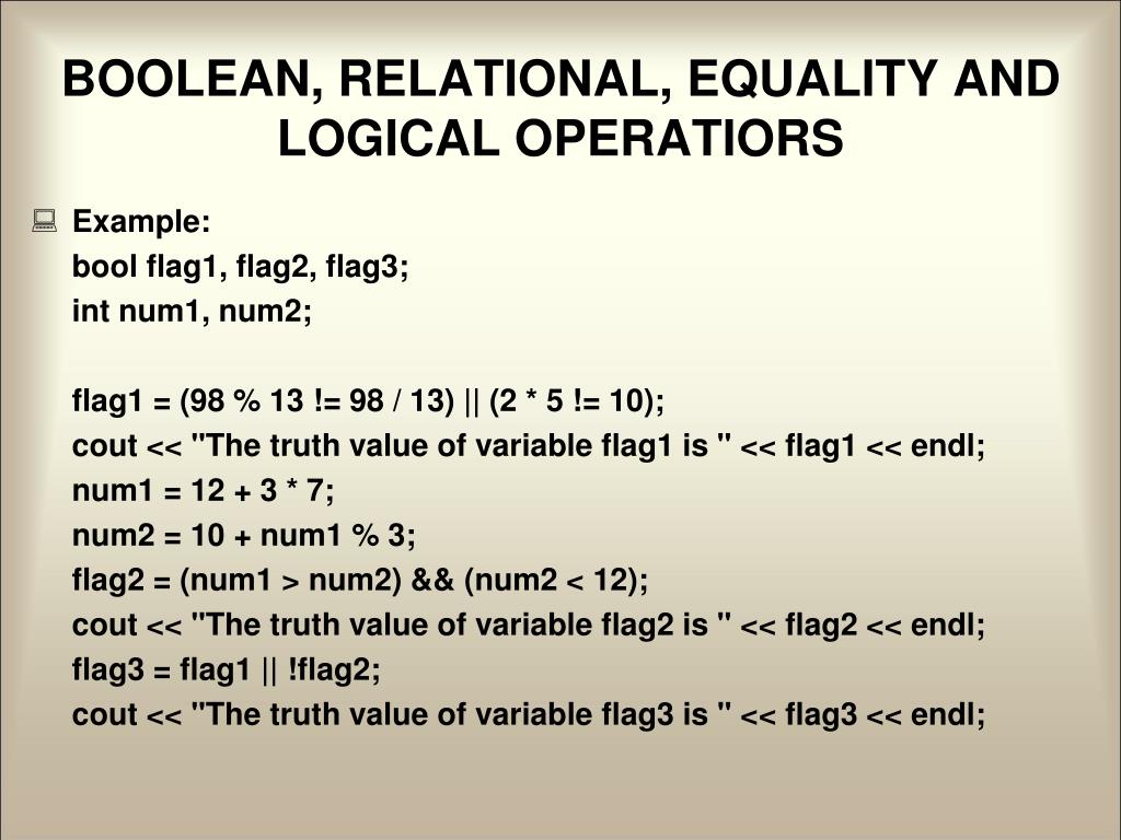 BOOLEAN, RELATIONAL, EQUALITY AND LOGICAL OPERATIORS • Example: bool flag1, flag2, flag3; int num1, num2; flag1 = (98 % 13 != 98 / 13) || (2 * 5 != 10); cout << "The truth value of variable flag1 is " << flag1 << endl; num1 = 12 + 3 * 7; num2 = 10 + num1 % 3; flag2 = (num1 > num2) && (num2 < 12); cout << "The truth value of variable flag2 is " << flag2 << endl; flag3 = flag1 || !flag2; cout << "The truth value of variable flag3 is " << flag3 << endl;