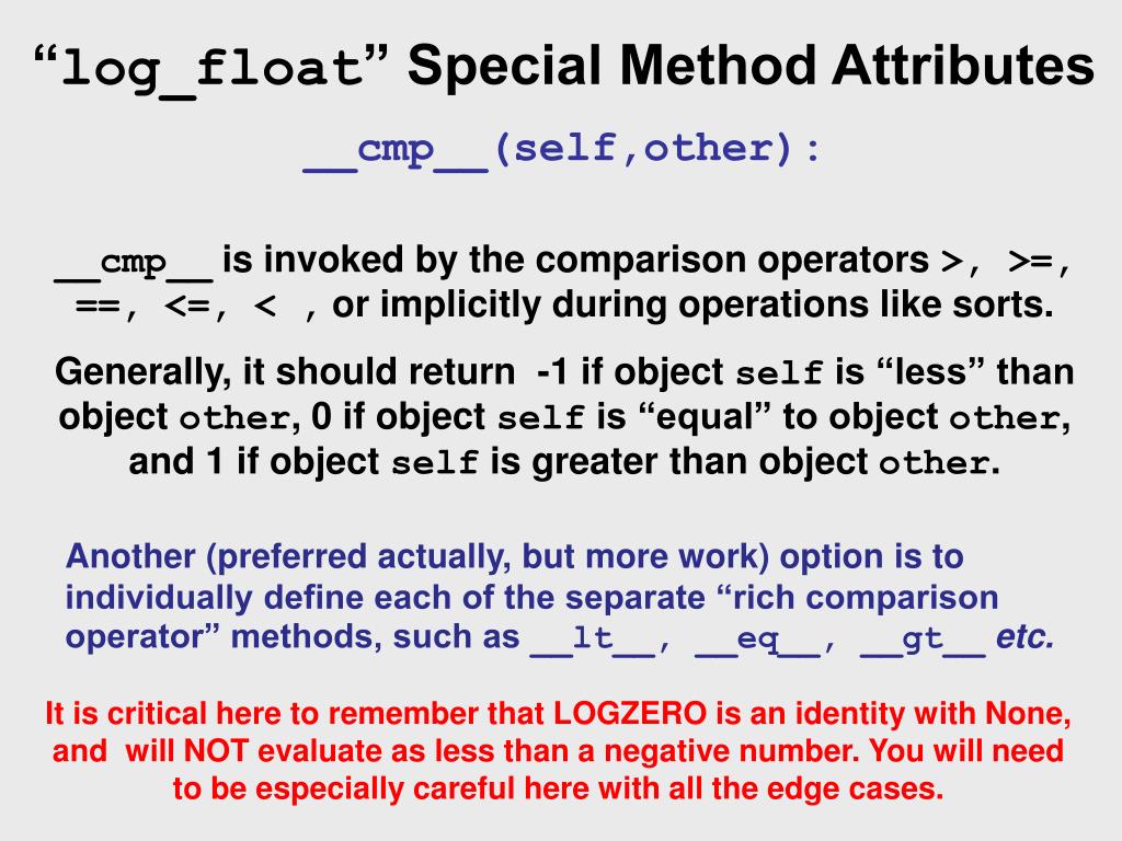 “log_float” Special Method Attributes __cmp__(self,other): __cmp__ is invoked by the comparison operators >, >=, ==, <=, < , or implicitly during operations like sorts. Generally, it should return -1 if object self is “less” than object other, 0 if object self is “equal” to object other, and 1 if object self is greater than object other. Another (preferred actually, but more work) option is to individually define each of the separate “rich comparison operator” methods, such as __lt__, __eq__, __gt__etc. It is critical here to remember that LOGZERO is an identity with None, and will NOT evaluate as less than a negative number. You will need to be especially careful here with all the edge cases.