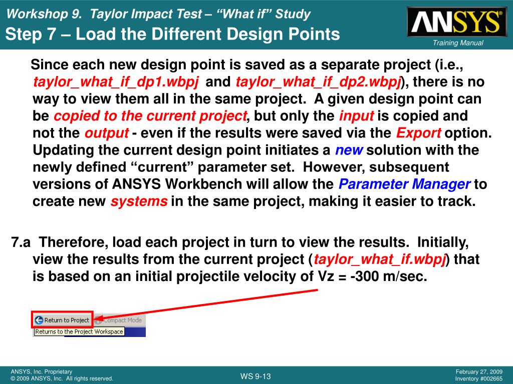 Step 7 – Load the Different Design Points Since each new design point is saved as a separate project (i.e., taylor_what_if_dp1.wbpj and taylor_what_if_dp2.wbpj), there is no way to view them all in the same project. A given design point can be copied to the current project, but only the input is copied and not the output - even if the results were saved via the Export option. Updating the current design point initiates a new solution with the newly defined “current” parameter set. However, subsequent versions of ANSYS Workbench will allow the Parameter Manager to create new systems in the same project, making it easier to track. 7.a Therefore, load each project in turn to view the results. Initially, view the results from the current project (taylor_what_if.wbpj) that is based on an initial projectile velocity of Vz = -300 m/sec.
