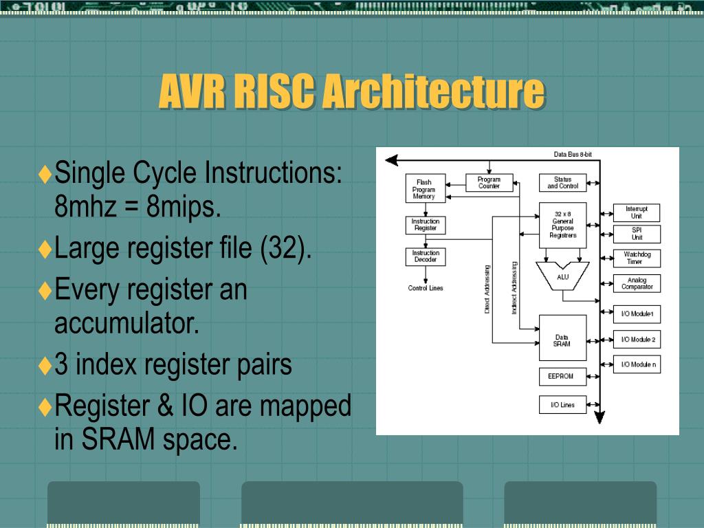 AVR. Modern RISC architecture: Compact and FAST. Tuned for high level languages. Consistent architecture across entire line. Small AVR are subsets of larger chips: Same hardware and code works across all chips. I/O structure reduces need for external components.
