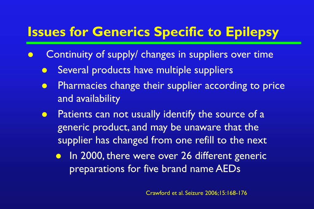 Issues for Generics Specific to Epilepsy • Continuity of supply/ changes in suppliers over time • Several products have multiple suppliers • Pharmacies change their supplier according to price and availability • Patients can not usually identify the source of a generic product, and may be unaware that the supplier has changed from one refill to the next • In 2000, there were over 26 different generic preparations for five brand name AEDs Crawford et al. Seizure 2006;15:168-176