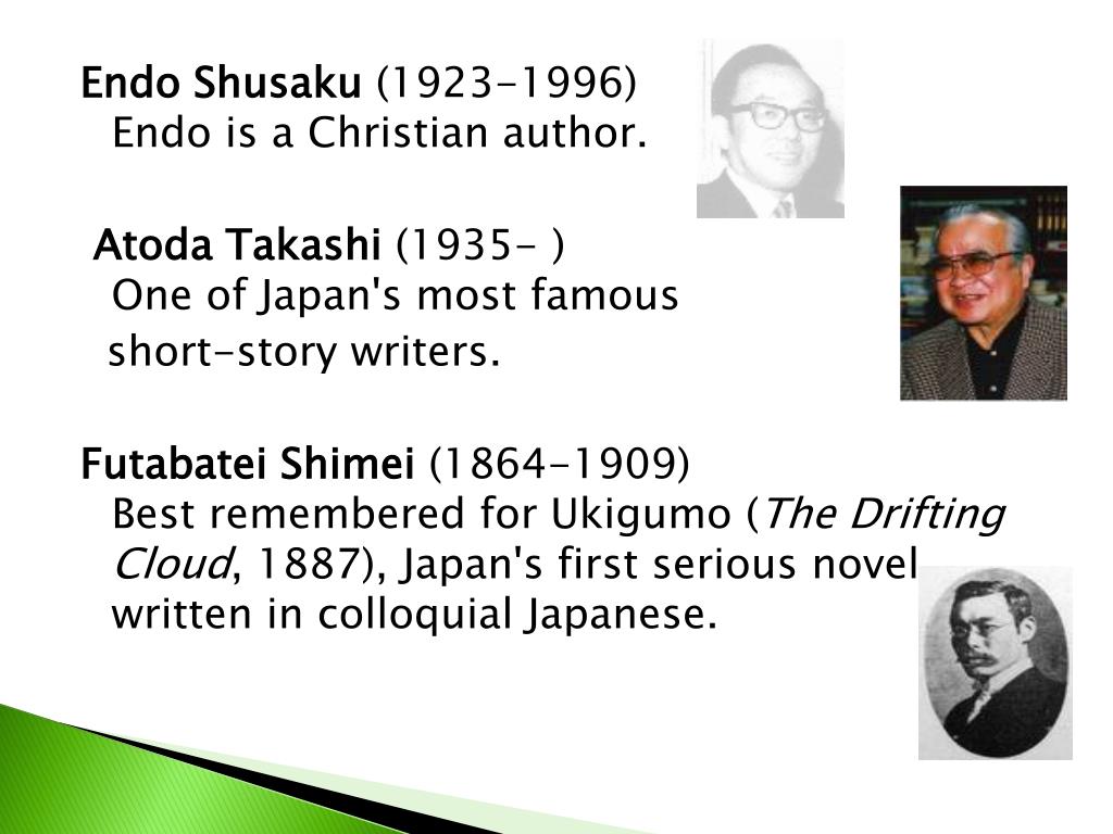 Endo Shusaku(1923-1996) Endo is a Christian author. Atoda Takashi (1935- ) One of Japan's most famous short-story writers. FutabateiShimei(1864-1909) Best remembered for Ukigumo (The Drifting Cloud, 1887), Japan's first serious novel written in colloquial Japanese.